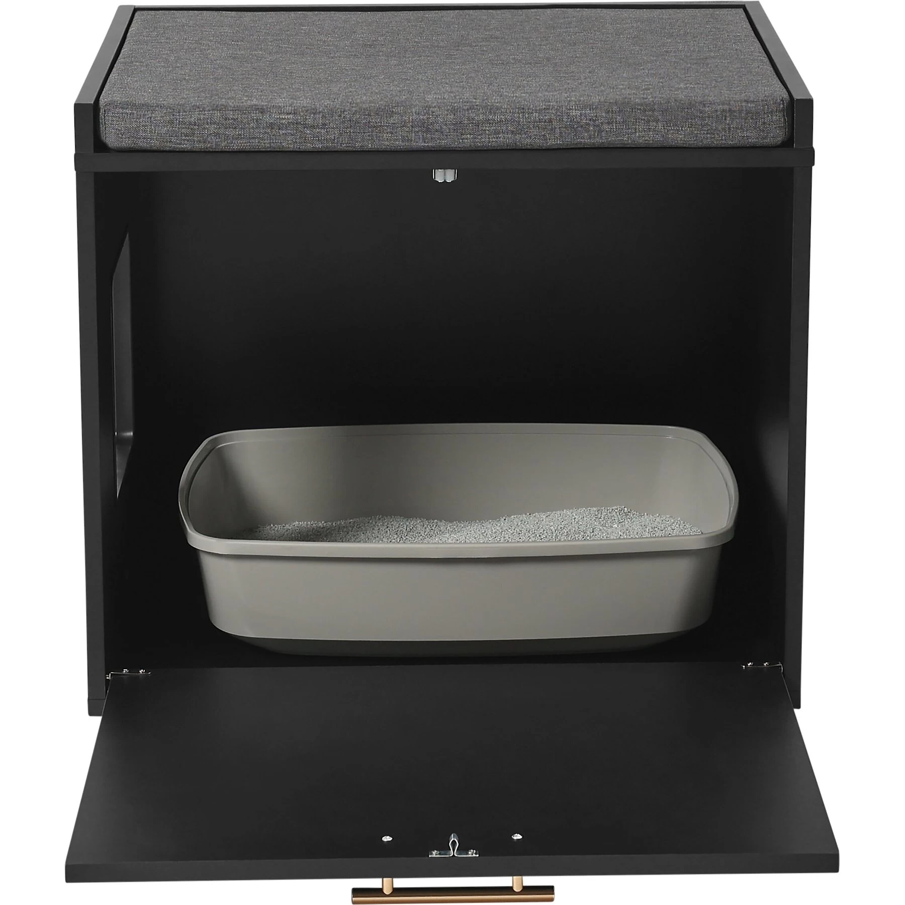 - The Frisco Drop Down Door Bench Cat Litter Box Cover elevates your home décor with its modern and minimalist aesthetic, and even has a bench for feline lounging.