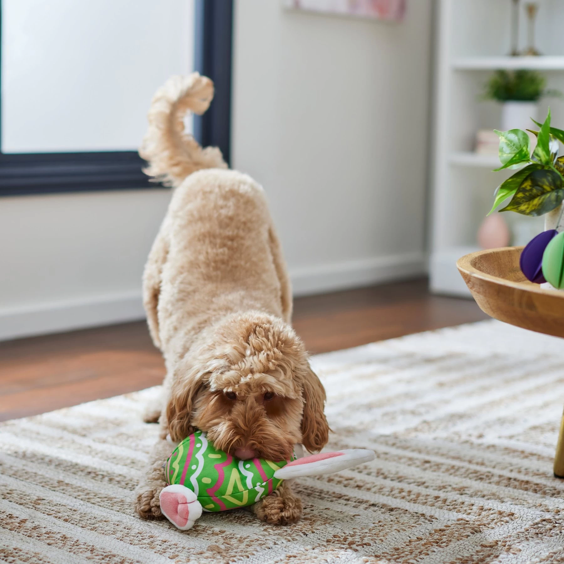 - This Easter Bunny egg plush toy is the perfect friend for all your dog’s springtime adventures.