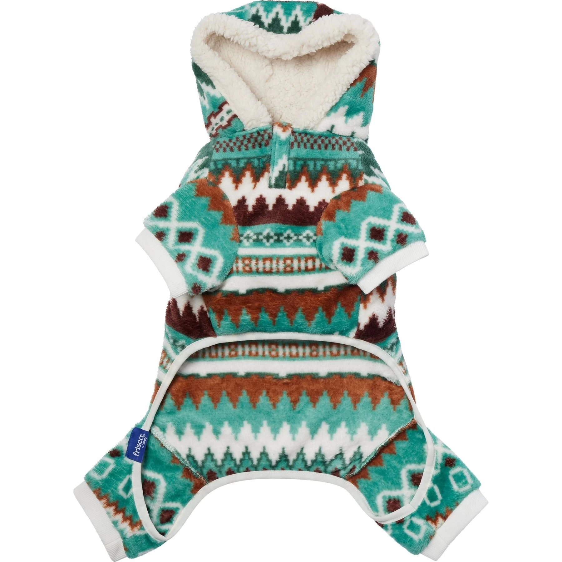 - Chocolate brown and mint Fair Isle-printed jammies and white sherpa-trimmed hood bring cozy comfort to your pet.