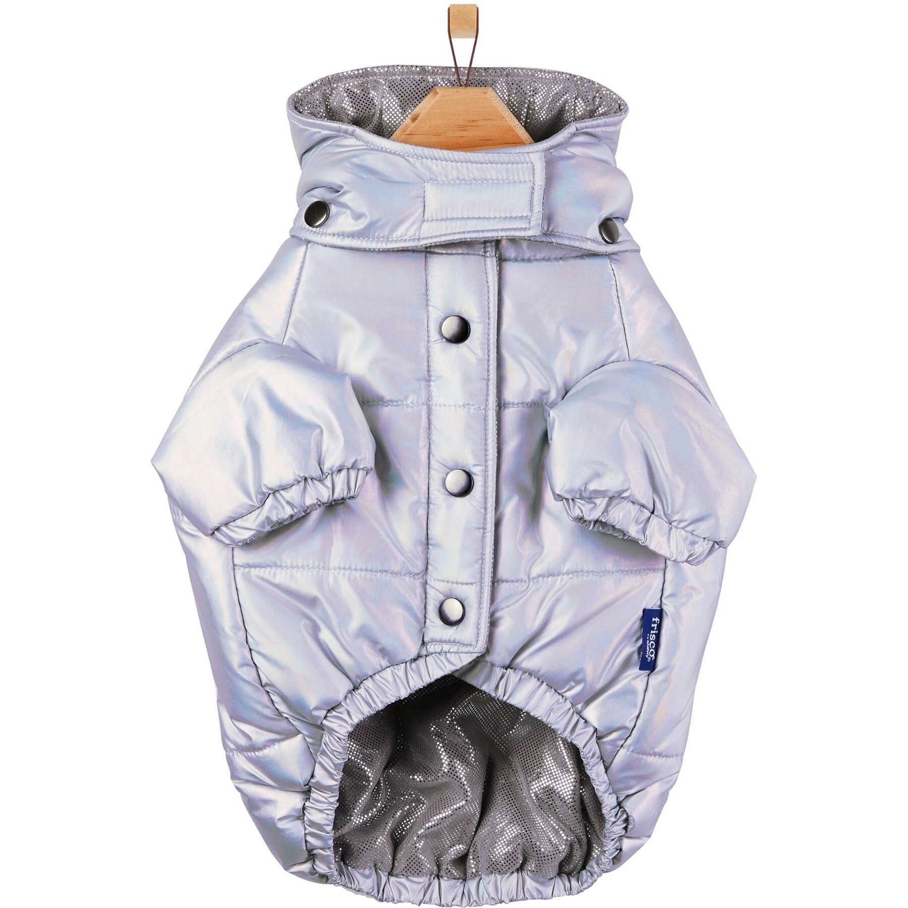 - This premium quilted puffer combines several snug features with a shimmery, iridescent-silver undertone shell that’ll make your pet shine.