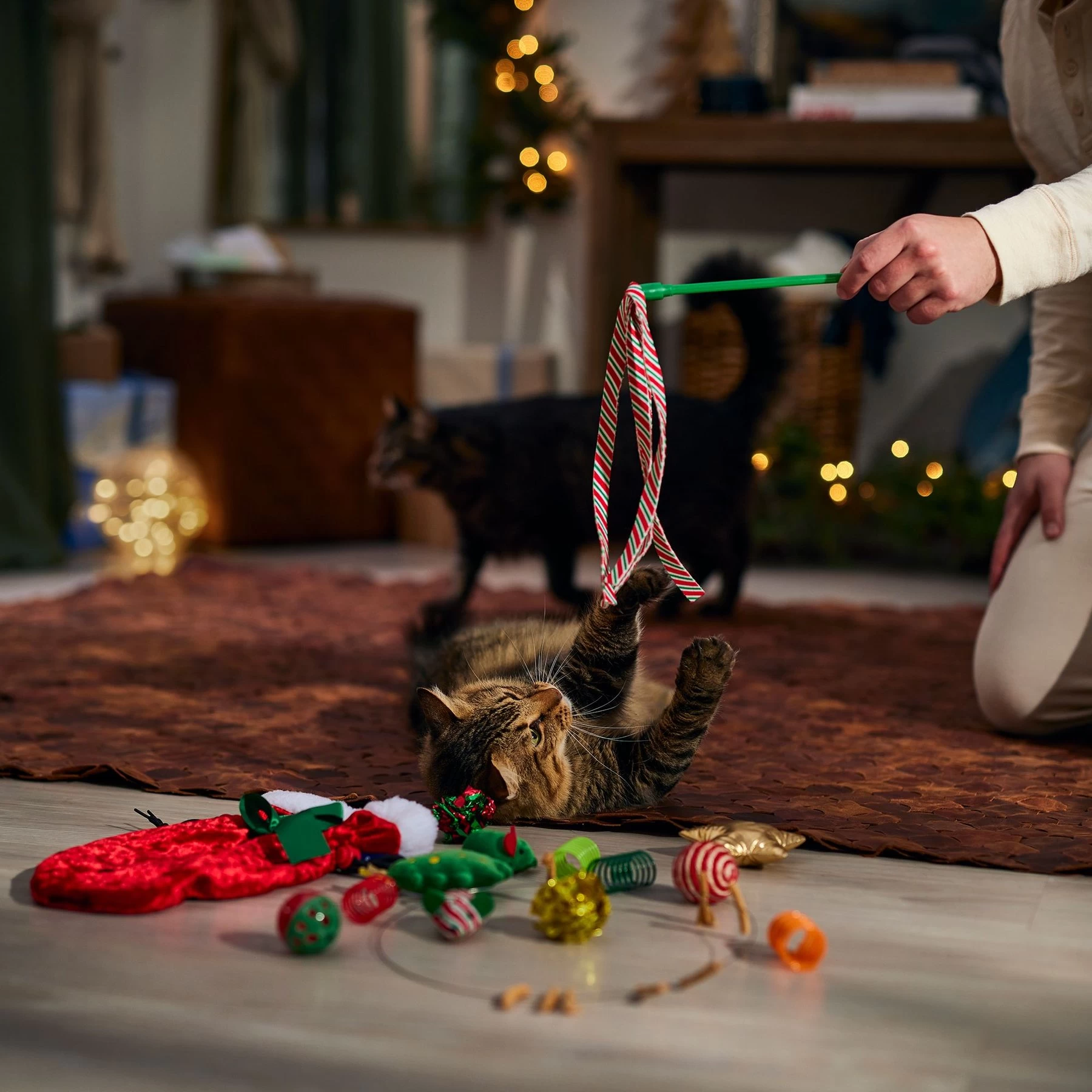 - Variety pack contains: one teaser wand, one wire teaser, two crinkle balls, one sisal ball, four plastic springs, one plastic ball, two plush mice, one metallic plush star toy, and one plush Christmas tree toy.