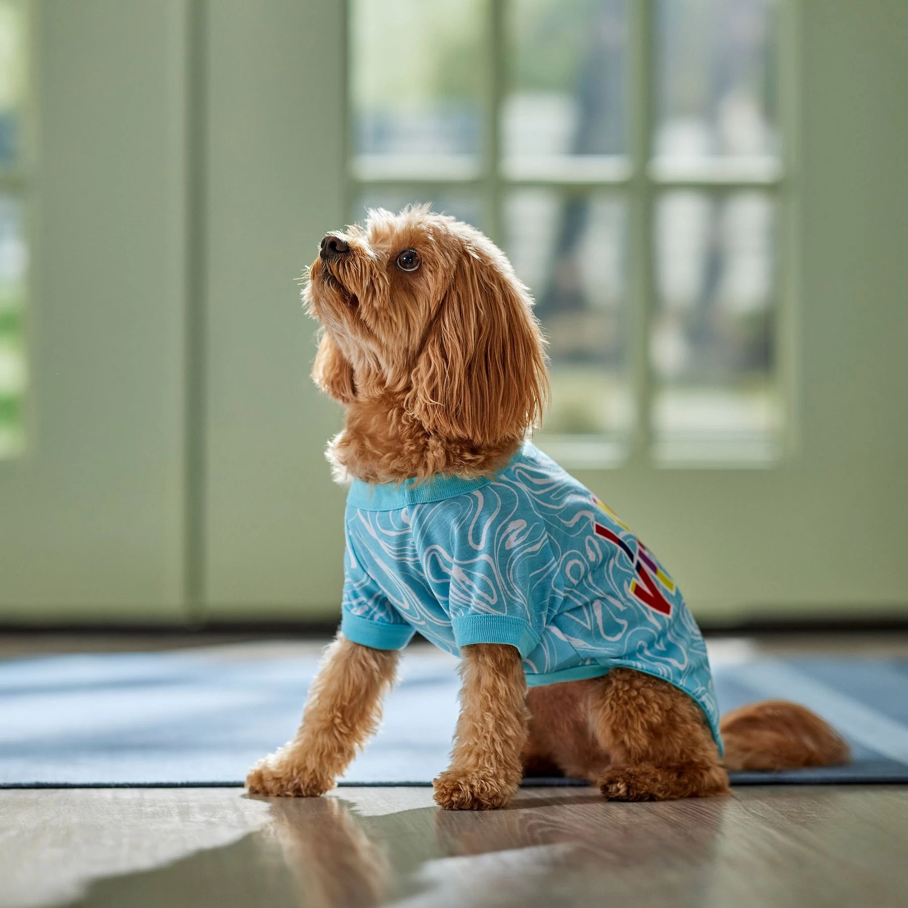 - The lettering is in classic beach-ball primary colors on an all over, ocean blue pattern with ribbed trim at the collar, sleeves and bottom.