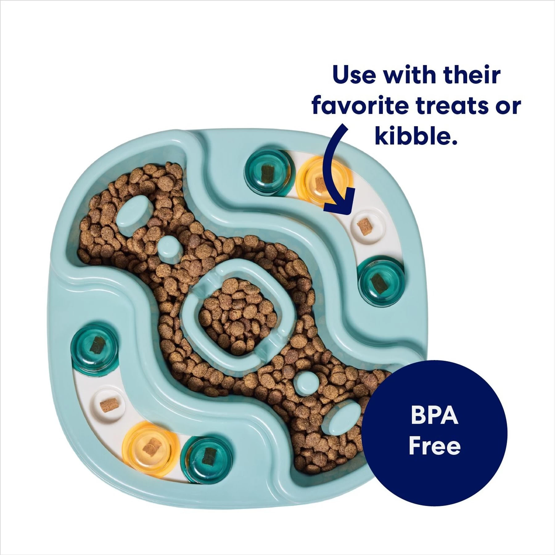 - This unique, two-in-one interactive puzzle features treat-hiding compartments and a large slow-feeder bowl to slow down your pet’s eating and promote better digestion.