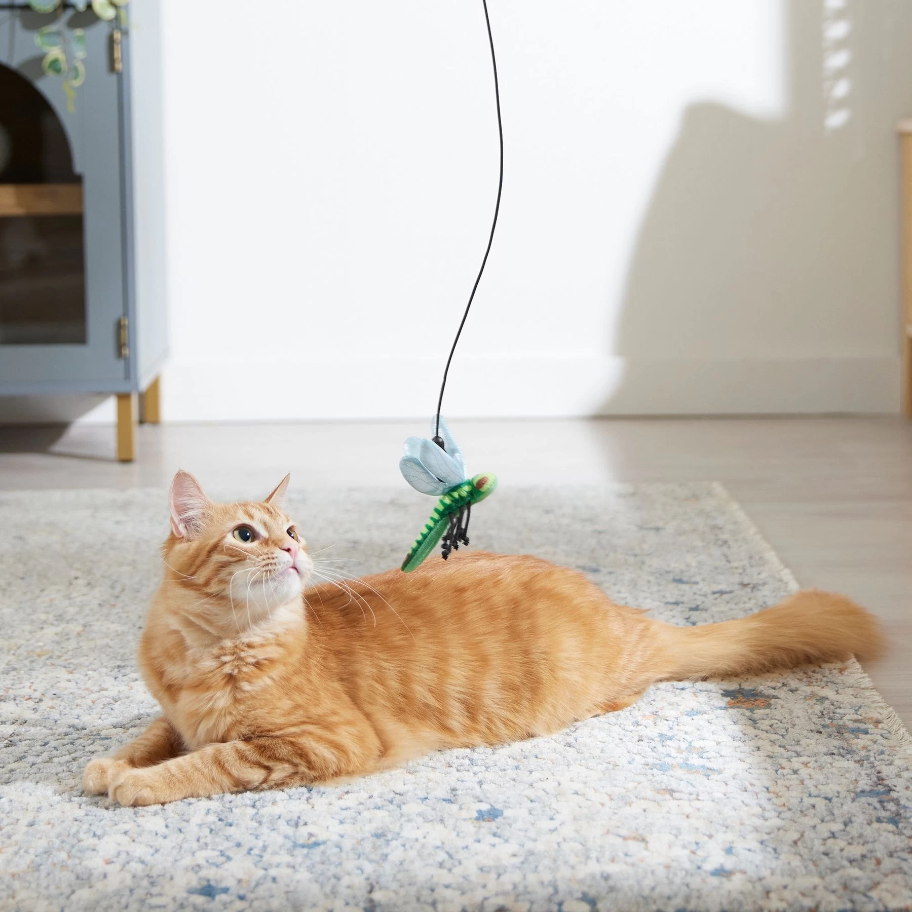 - Includes two interchangeable plush toy options to attract your cat’s attention—a dainty dragonfly with crinkly wings or an oversized tree leaf with ribbons.