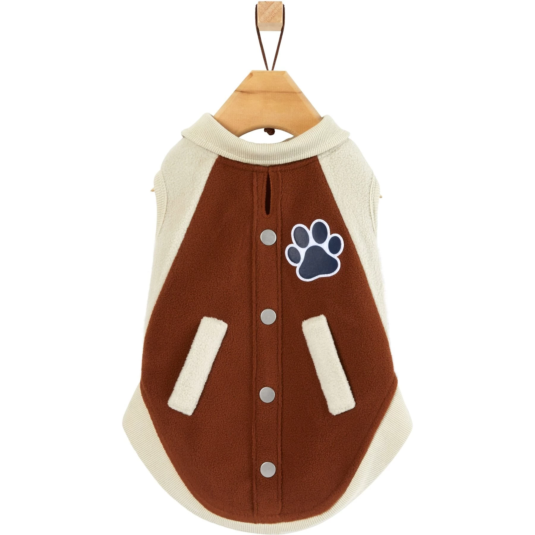 - From Frisco by Chewy. This varsity jacket comes in a cozy collegiate-style design that will give your pet a sporty yet sophisticated look while keeping them warm.