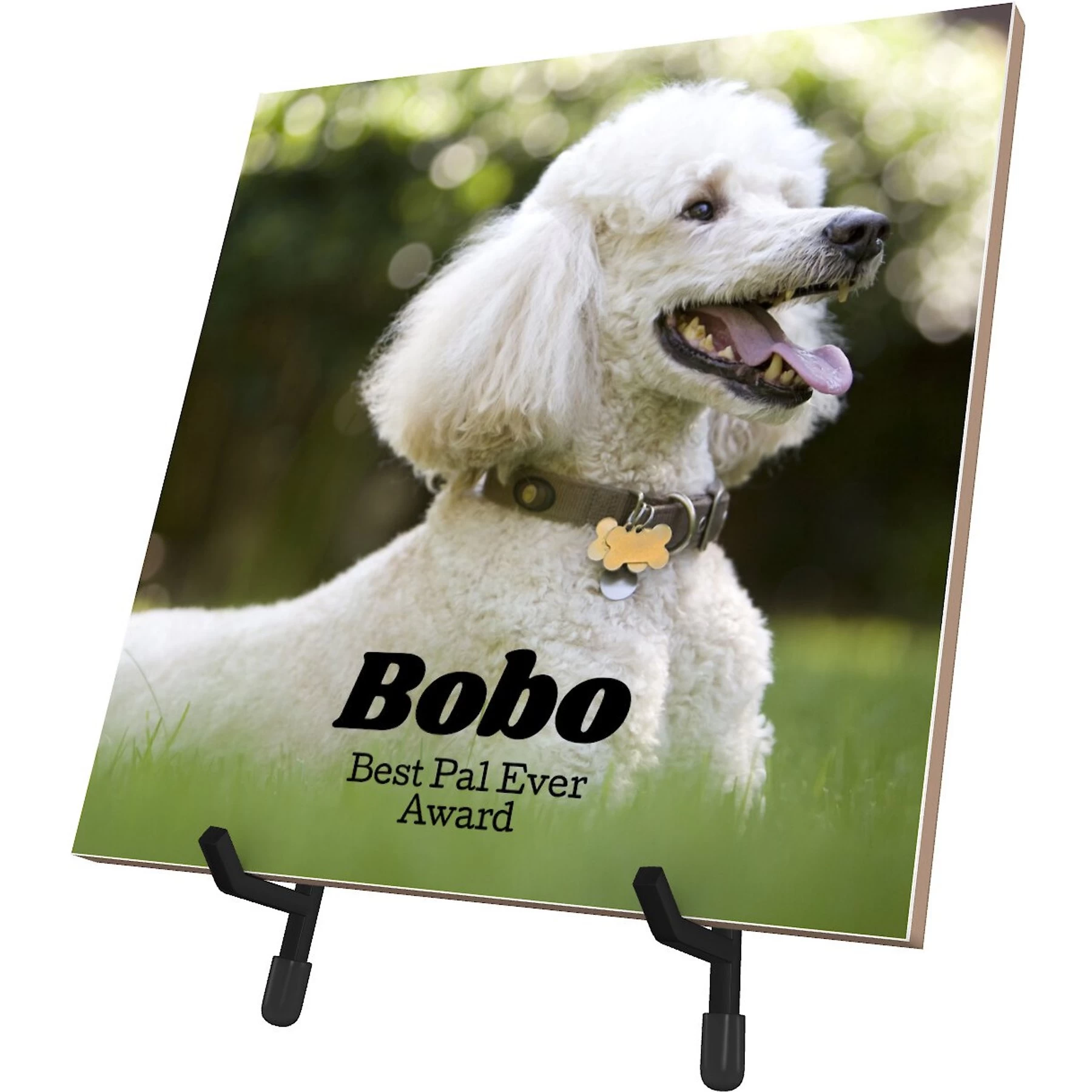- 8×10-inch ceramic photo tile with a built-in metal stand for easy display.