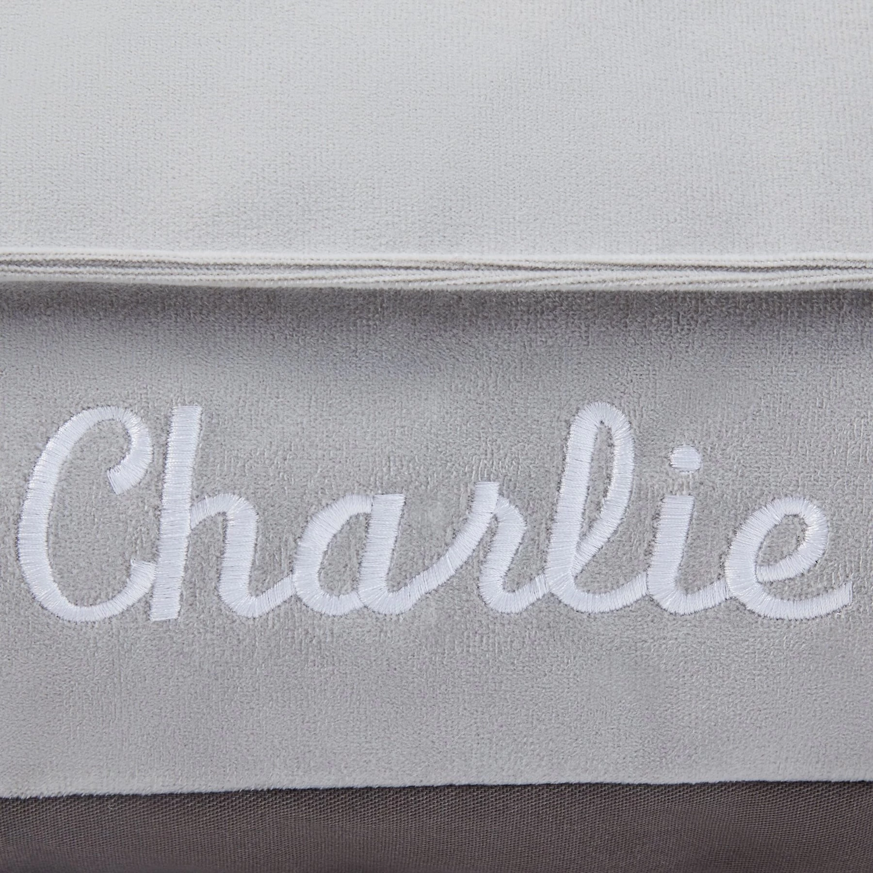 - Back bolster-style bed, customizable with up to 10 1-inch characters, perfect for their name.