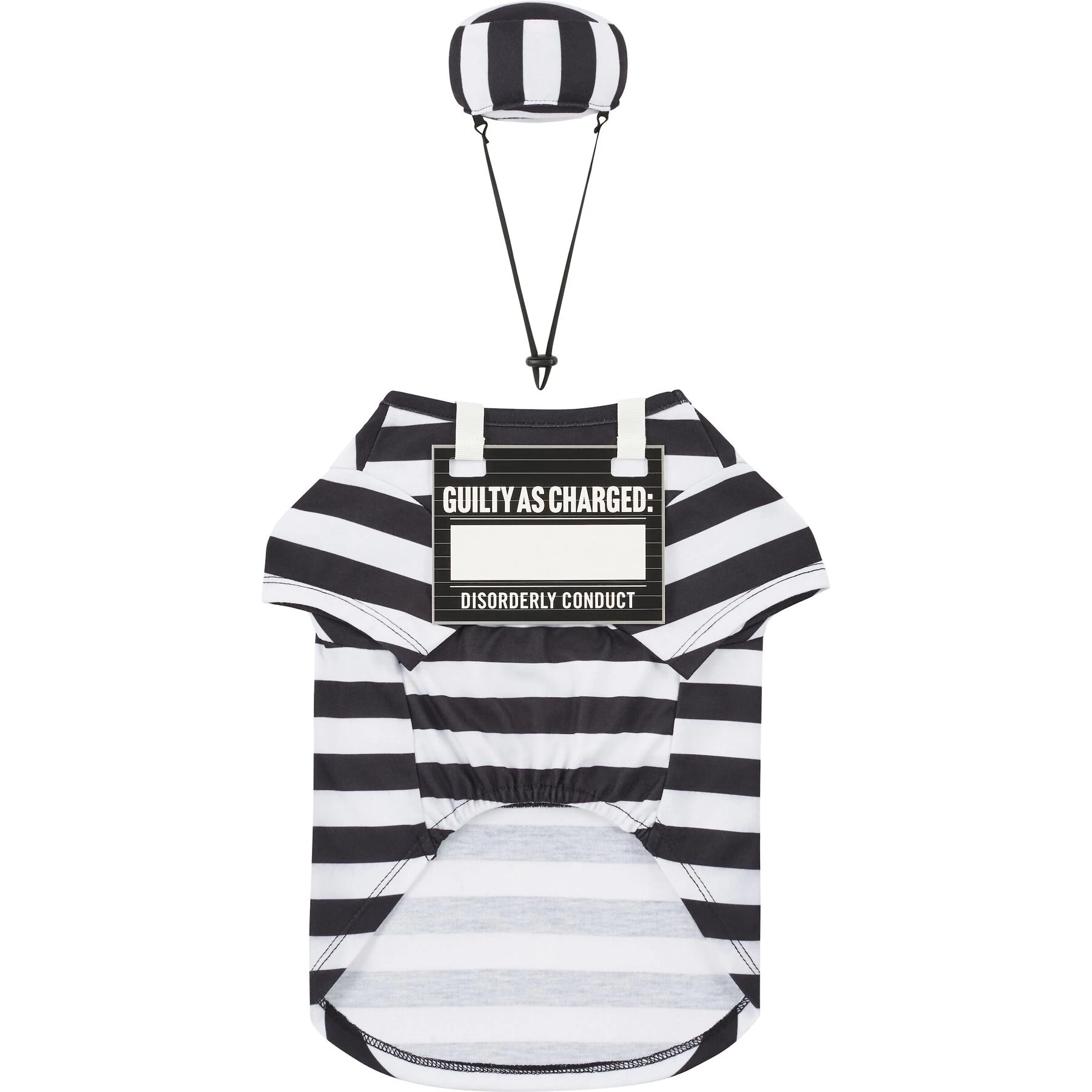 - Two-piece prisoner costume includes a striped shirt and a separate hat.