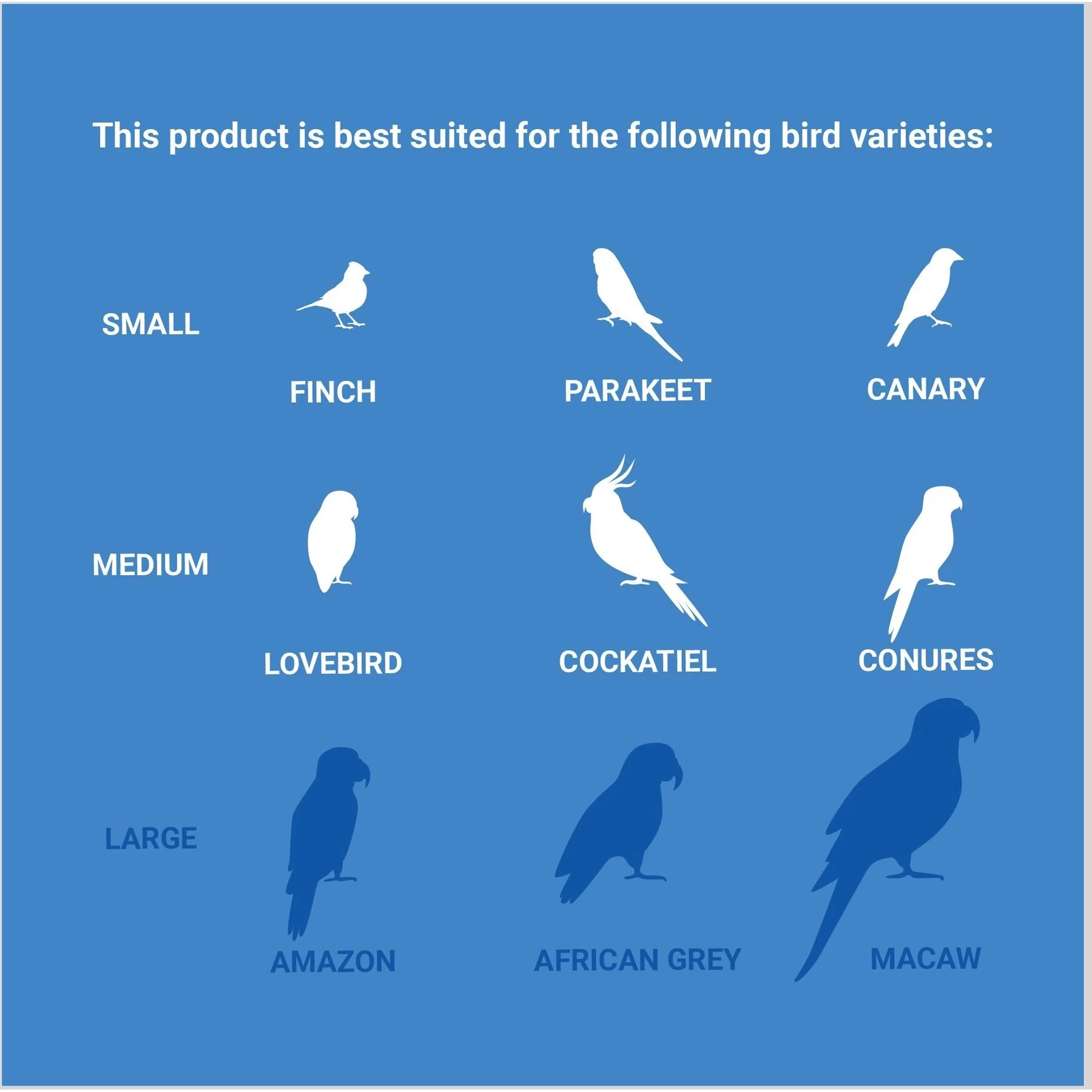 - Features a clasp and hook so you can hang it anywhere for playdates. Best suited for Parrots, Parakeets, Lovebirds, Finches, Canaries and Cockatiels.