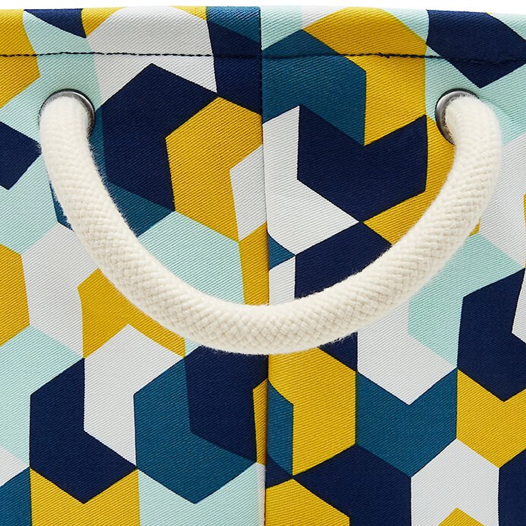 - Round, collapsible bin covered with polyester fabric featuring a quirky, yellow geometric pattern.