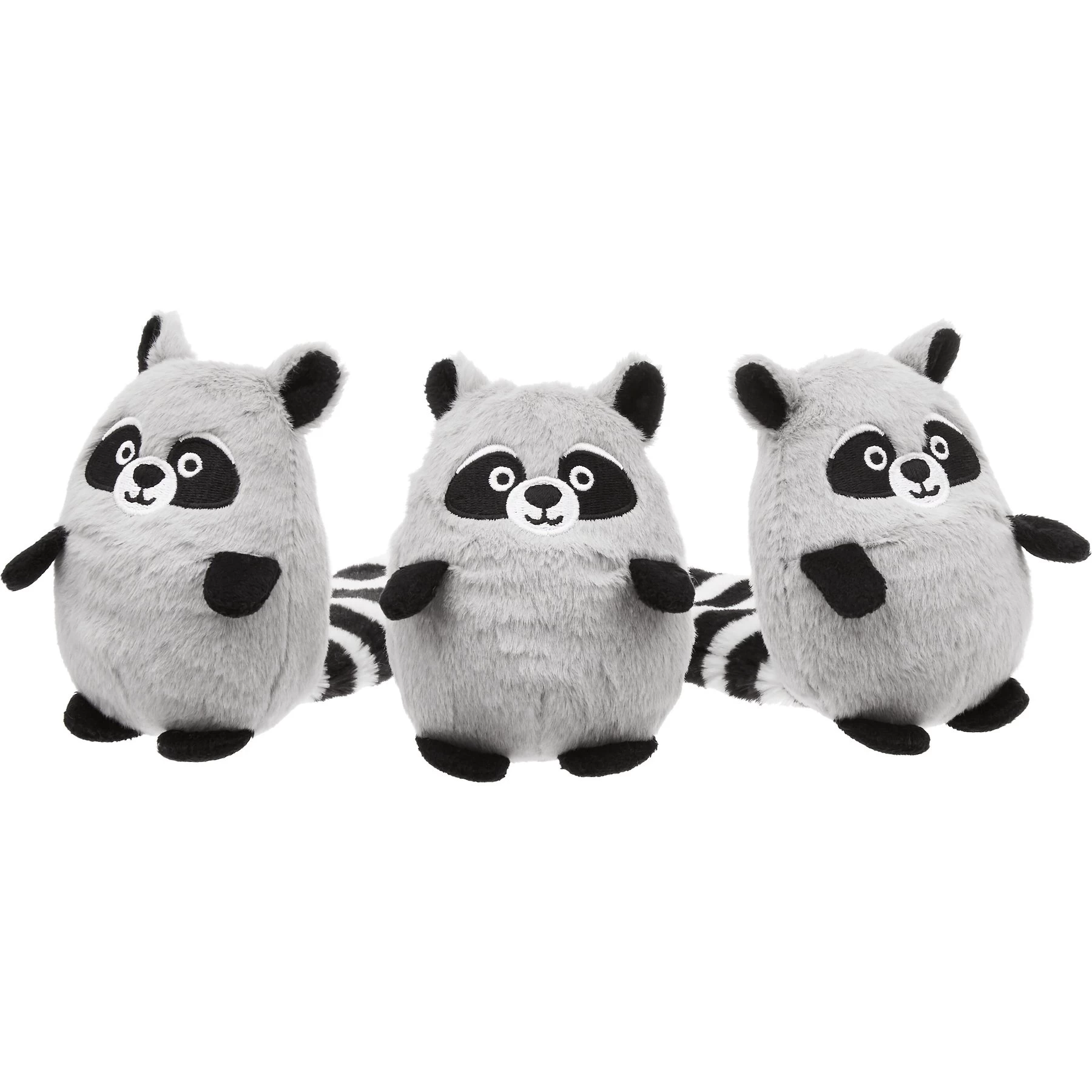 - These soft racoons each have a squeaker for added fun.