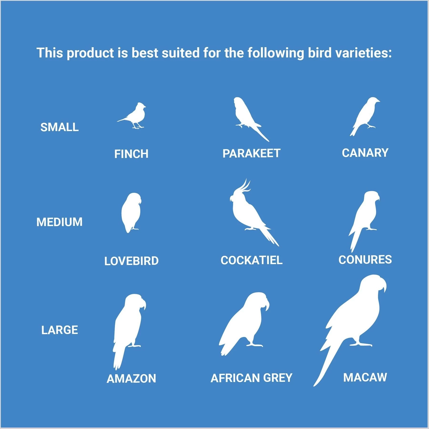- Features a clasp and hook so you can hang it anywhere for playdates. Best suited for Macaws, African Greys, Amazons, Parakeets, Lovebirds, Finches, Canaries and Cockatiels.